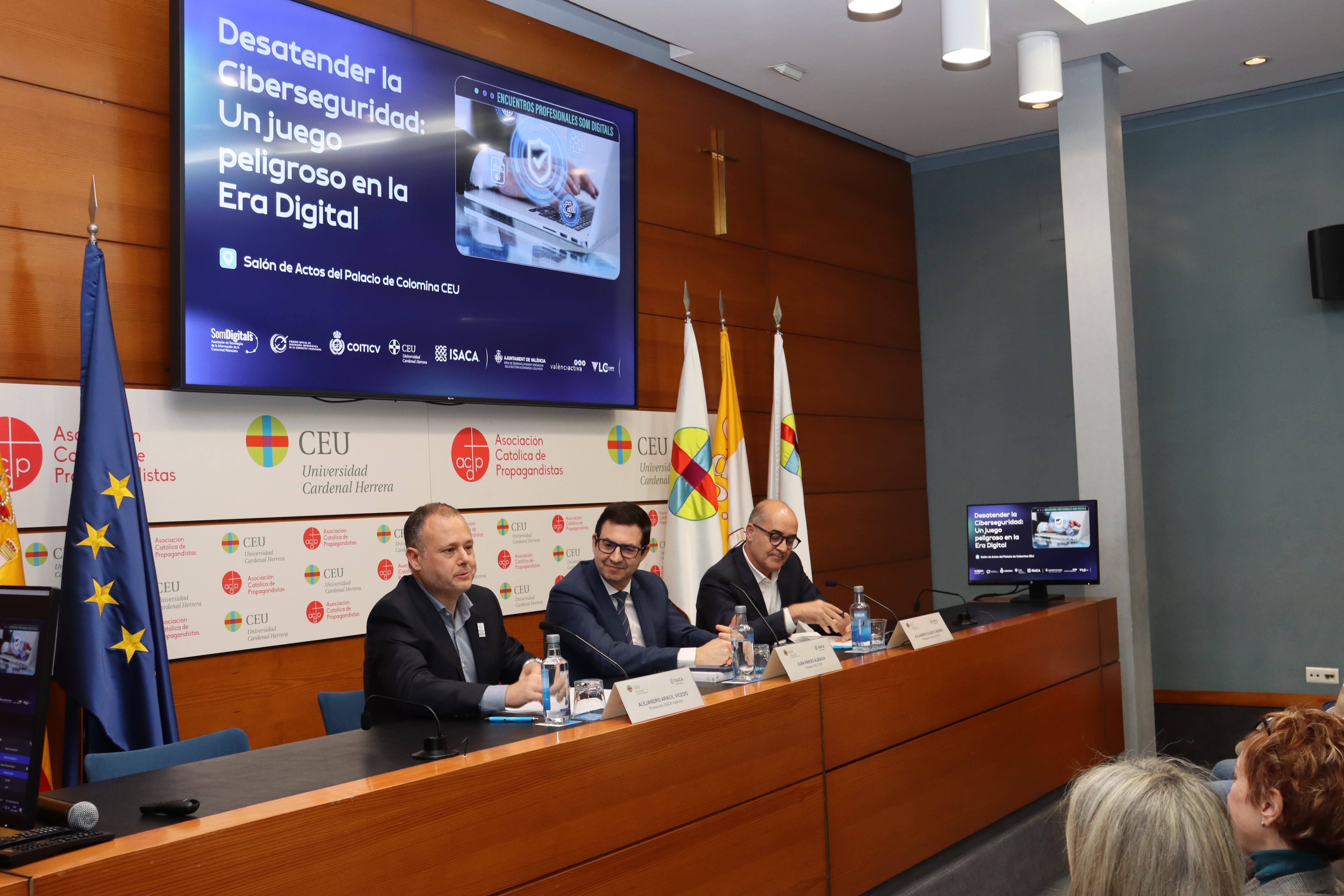 Alejandro Blasco, presidente de Som Digitals y del COIICV, Juan Pardo, representante del CEU, y Alejandro Aracil, presidente de ISACA-Valencia, han inaugurado la sesión. Blasco ha destacado que “las tecnologías de la información son el principal acelerador de la innovación y generan grandes retos y oportunidades. También introduce riesgos sobre los que hay que estar atentos. Tenemos la obligación moral de que ciudadanos y empresas entiendan la importancia de segurizar sus datos y activos y de contar con profesionales cualificados para ello”. “Hoy hablaremos de tendencias en ciberataques, delitos electrónicos, desinformación y ciberguerra; así como los mecanismos de prevención que se están desarrollando para luchar contra las crecientes amenazas a las que nos enfrentamos en un mundo cada vez más digital y conectado”, ha explicado.