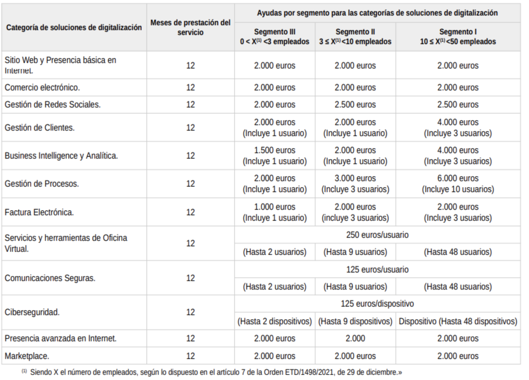 Tras la concesión del bono digital, el beneficiario deberá seleccionar y contratar la solución o soluciones de digitalización que desee adoptar de entre las disponibles en el Catálogo de Soluciones de Digitalización del Programa que incluye las categorías de sitios web y presencia básica en internet; comercio electrónico; gestión de redes sociales; gestión de clientes; business intelligence y analítica; gestión de procesos; factura electrónica; servicios y herramienta de oficina virtual; comunicaciones seguras y ciberseguridad. Además, se añaden dos categorías que no existían hasta la fecha: la presencia avanzada en internet y los Marketplace.